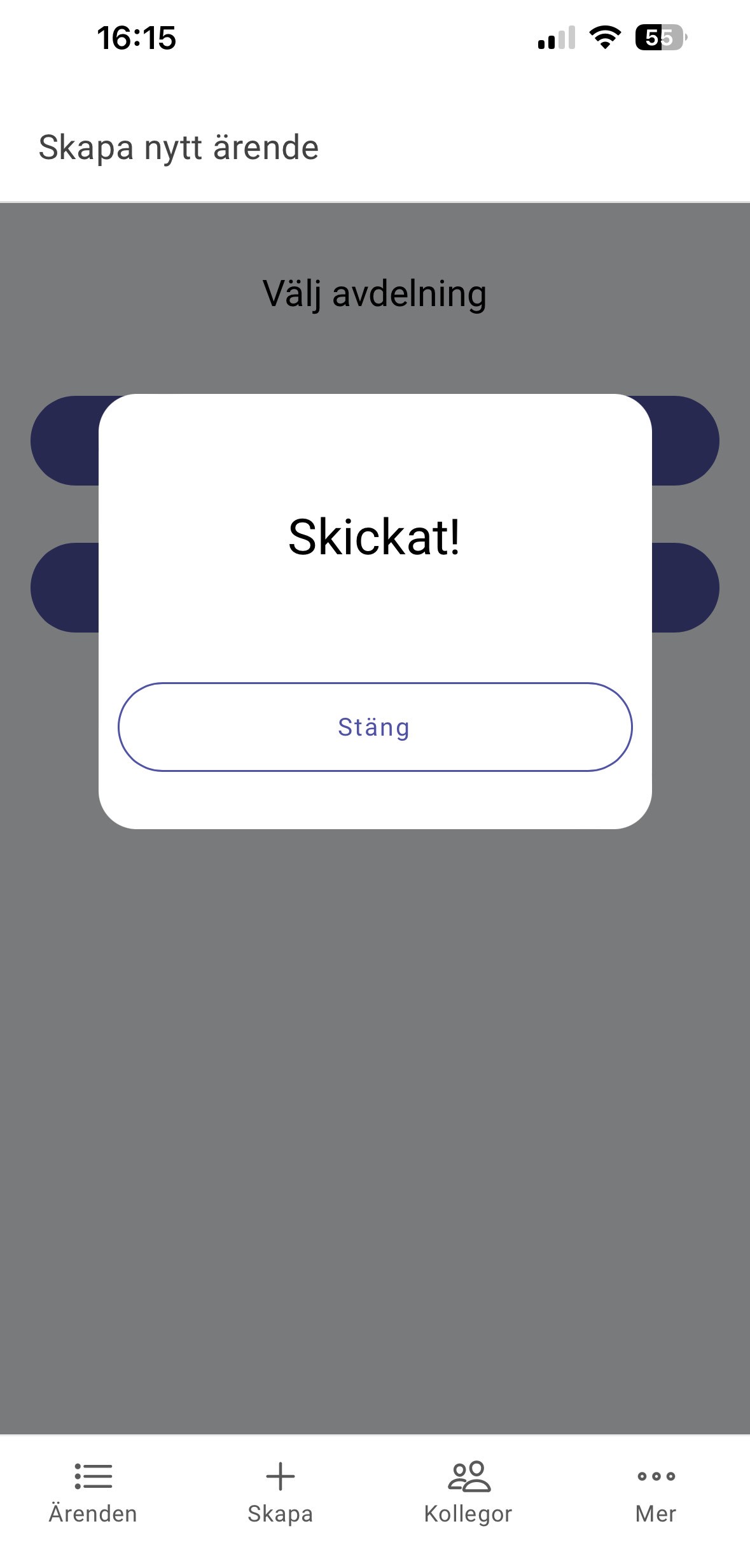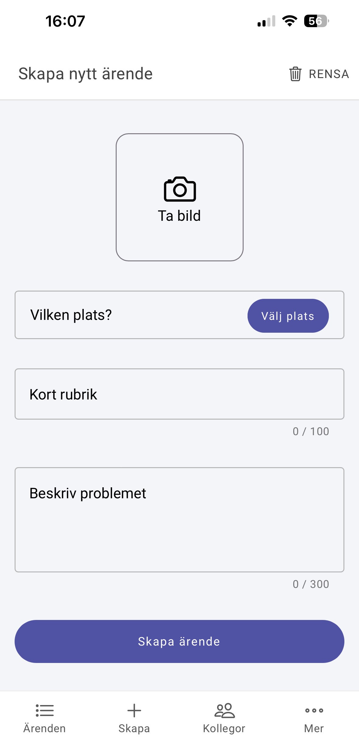 Om du klickar på Skapa i menyn längst ner, kommer du till en vy med ett formulär där du kan rapportera ett nytt ärende genom att fylla i nödvändiga uppgifter.