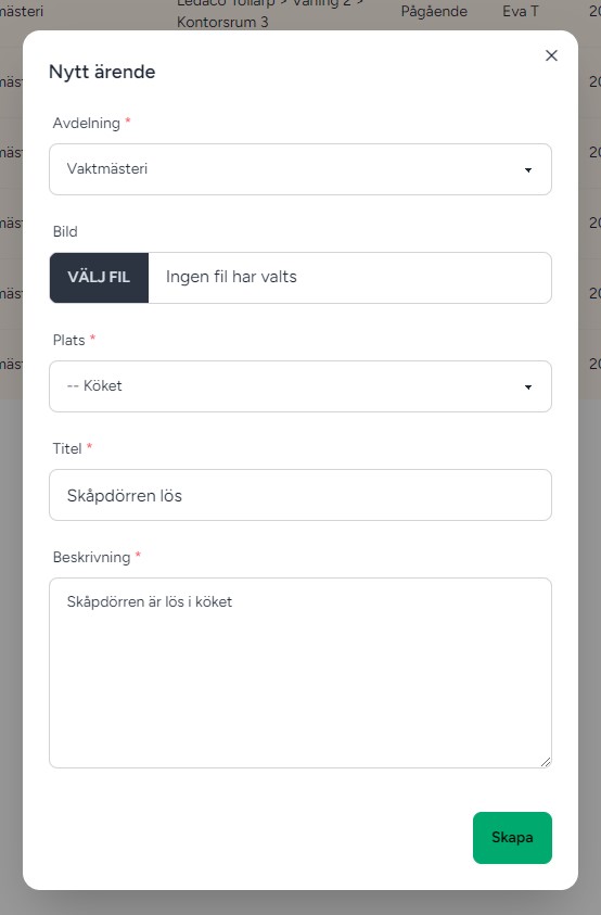 När du klickar på den öppnas en ruta med ett formulär där du kan fylla i detaljer för att rapportera ett nytt ärende.