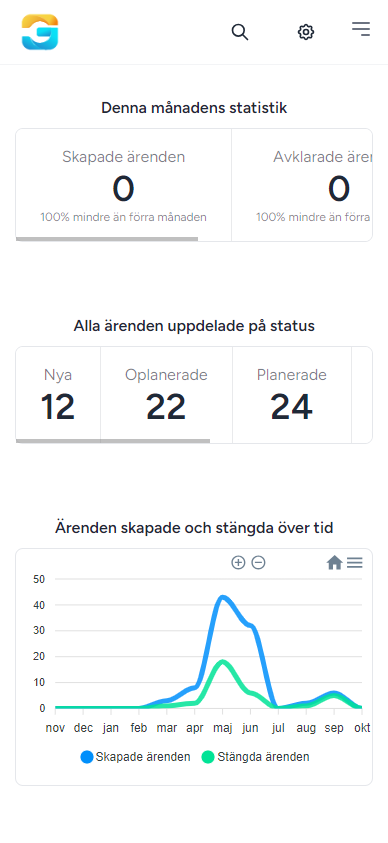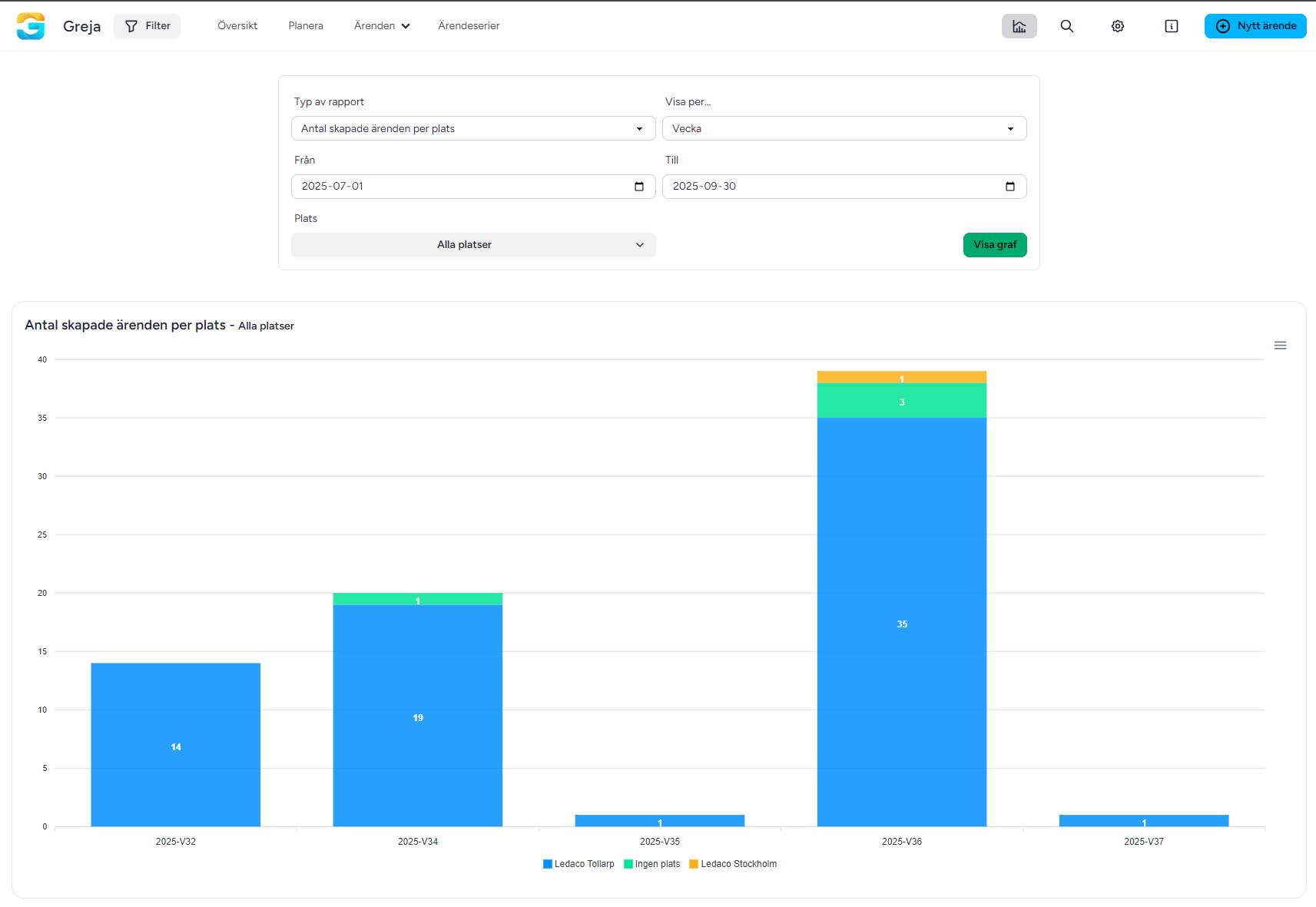 Ny analysdashboardNu kan du enkelt följa upp ärenden med vårt nya analysverktyg! Filtrera statistik efter datum, plats eller utförare.