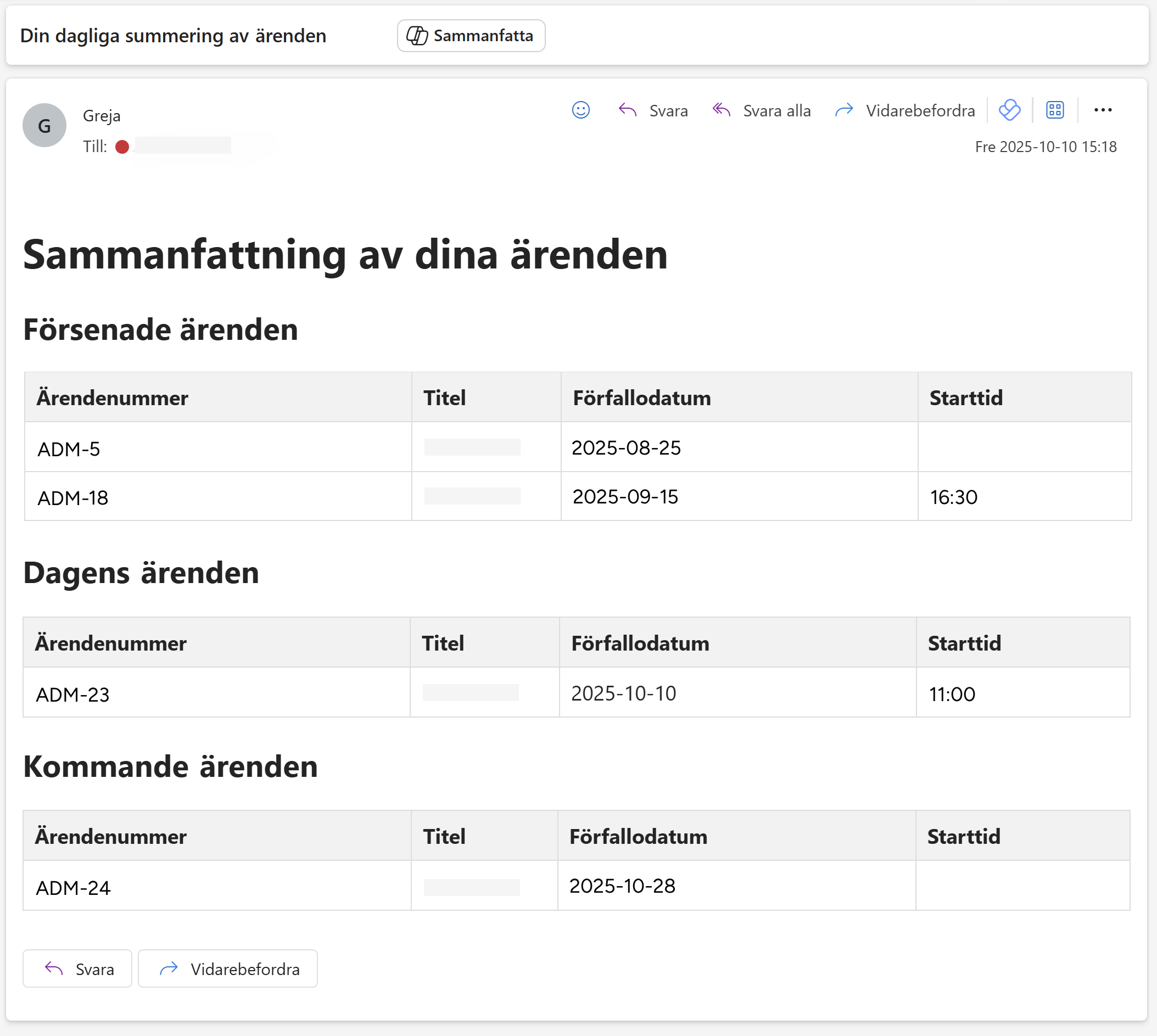 E-postsummering av dina ärendenAdmins och utförare kan nu aktivera “E-post: summering av ditt arbete” under Min profil för att få en daglig översikt över försenade, dagens och kommande ärenden.