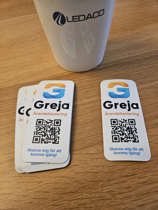 KlistermärkenFör att underlätta införandet av Greja Ärendehantering skickar vi med små klistermärken med QR kod som kan sättas upp i personalrum eller var helst nya användare behöver få en påminnelse. Hör av er till oss på info@greja.app så skickar vi ut till er.